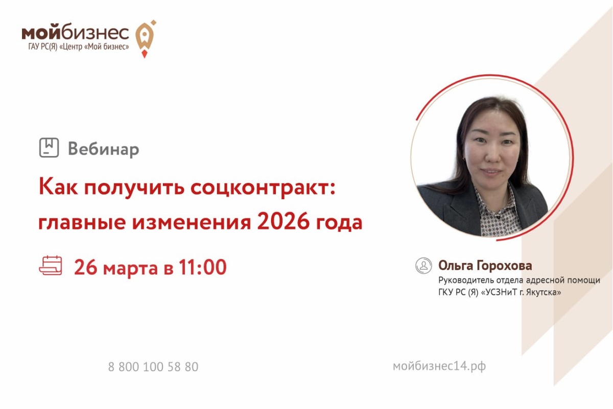 🚀 Центр «Мой бизнес» приглашает вас принять участие в вебинаре «Как получить соцконтракт: главные изменения 2026 года» Социальный контракт — это форма поддержки граждан, направленная на улучшение их жизненных условий и преодоление трудной финансовой ситуации. 📍 В программе вебинара: — Определение социального контракта; — Перечень документов, необходимых для подачи заявления на получение соцконтракта; — Главные изменения в 2026 году; — Ответы на ваши вопросы. 🎙 Спикер: Горохова Ольга Саввична - руководитель отдела адресной помощи ГКУ РС (Я) «УСЗНиТ г. Якутска» 🖥 Формат: онлайн 📅 Дата: 26 марта ⏰ Время: 11:00 👉🏻 Ссылка для регистрации: https://forms.yandex.ru/cloud/69b1215a50569076ebabb1e1 Ссылка для подключения к вебинару будет отправлена на указанный вами электронный адрес или телефонный номер через MAX. Не упустите возможность узнать важную информацию о социальных контрактах и задать интересующие вас вопросы! 📲Напоминаем, что канал Центра "Мой бизнес" запущен в МА