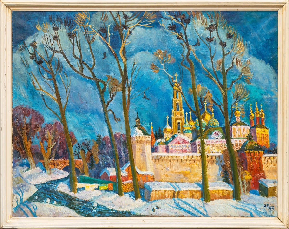 ). "Весна в Загорске". 1978. На обороте авторские название и дата, листок протокола Художественного совета Загорской художественной мастерской "Мособлхудожфонда". Советский и российский живописец, график и скульптор, родился 1 июля 1936 года в небольшом селе Москалевка Семиозерного (ныне Аулиекольского) района Кустанайской области в большой семье. Николай Куц поступил в Московское художественно-графическое педагогическое училище, закончил в 1958 году. Потом - служба в советской армии. В 1962 году он переезжает в Переславль-Залесский, где поначалу работает в школе учителем рисования, а позже организует художественную школу при Доме Культуры. С 1964 года Куц Николай Константинович участвует в выставках Ярославского Союза художников. С 1972 года художник жил и творил в Загорске. В этом же 1972 году Куц Николай Константинович вступил в Союз художников РСФСР. Помимо живописи и графики Куц успешно упражнялся в скульптуре и резьбе по дереву, но живопись оставалась в его сердце главной