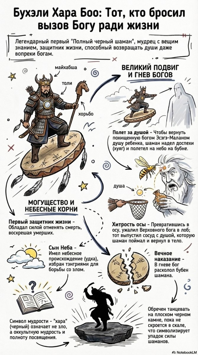 Легендарный первый «Полный черный шаман» Бухэли Хара Боо обладал вещим знанием и силой отменять смерть. Его имя «хара» (черный) означает не зло, а оккультную мудрость и высшую полноту посвящения. Великий подвиг и гнев богов Когда Верховный бог Эсэгэ-Малан похитил душу ребенка, шаман надел боевые доспехи и полетел на небо на своем бубне. Превратившись в осу, он ужалил Бога в лоб. От неожиданности Эсэгэ-Малан выпустил сосуд с душой, которую шаман поймал и вернул в тело ребенка. Вечное наказание В гневе бог расколол бубен шамана, что символизирует упадок силы последующих поколений. Бухэли Хара Боо был обречен танцевать на плоском черном камне, пока не скрылся в скале. Эта легенда напоминает о временах, когда могущество шаманов позволяло им вступать в прямой спор с небожителями ради спасения человеческой жизни. Канал нашей студии https://t.me/chimitdorzhi_studio