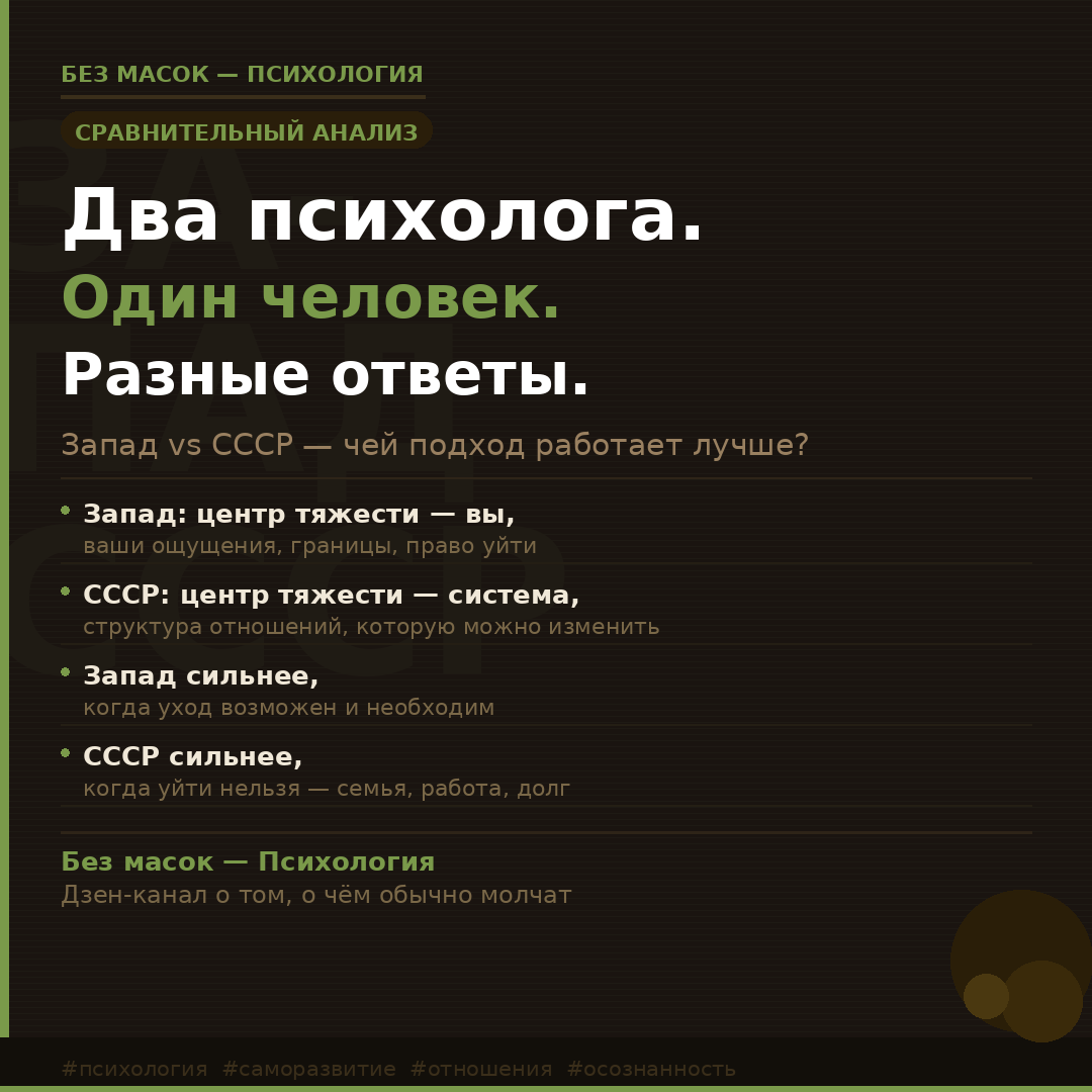 Кроме того, советская психология точнее замечает вашу собственную роль в системе. Не из позиции обвинения — из позиции влияния. Если ты часть системы, значит, ты можешь на неё влиять.