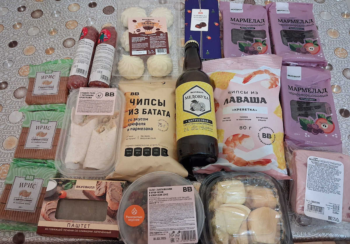 Сначала вот такой набор из ВВ: - Ирис с орехом кешью 150 г Моя любовь! Выбираю любимым продуктом, и покупаю сразу несколько штук. Потом буду пару месяцев потихоньку есть. Ирис главное хорошо упаковать после открытия упаковки. Чтобы он не сох! Потому что мягкий ирис шикарен. А вот если подсохнет – будет уже меньше удовольствия. - Медовуха "Цитрусовая", 500 мл Распробовала Цитрусовую. Сначала она мне не очень понравилась. Прекрасное сочетание вкуса и цены. - Чипсы из лаваша "Креветка", 80 г Терпимый состав. Состав - мука пшеничная хлебопекарная высшего сорта, масло подсолнечное рафинированное дезодорированное, вода питьевая, приправа вкусовая Креветка (мальтодекстрин, креветка порошок, соль пищевая, сахар, крахмал кукурузный), соль пищевая, сахар, мука кукурузная Но они довольно острые в плане текстуры. Есть нужно осторожно. И слишком жирные, на мой вкус. Я их повторять не буду. - Чипсы из батата со вкусом трюфеля и пармезана 75 г А вот эти чипсы очень вкусные! Состав - батат сушёный кра