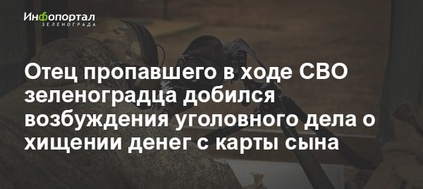 Вскоре всплыла странная история с банковской картой, оформленной на его имя, на которую вместо основной карты зачислялись положенные военнослужащему выплаты. Спустя полгода отцу погибшего удалось добиться возбуждения уголовного дела о хищении денег с карты его сына. Подробности в публикации Инфопортала 🔵 Прислать новость Инфопортал Зеленограда в соцсетях ⬇️ 🔵 Telegram 📲 MAX 🌐 VK