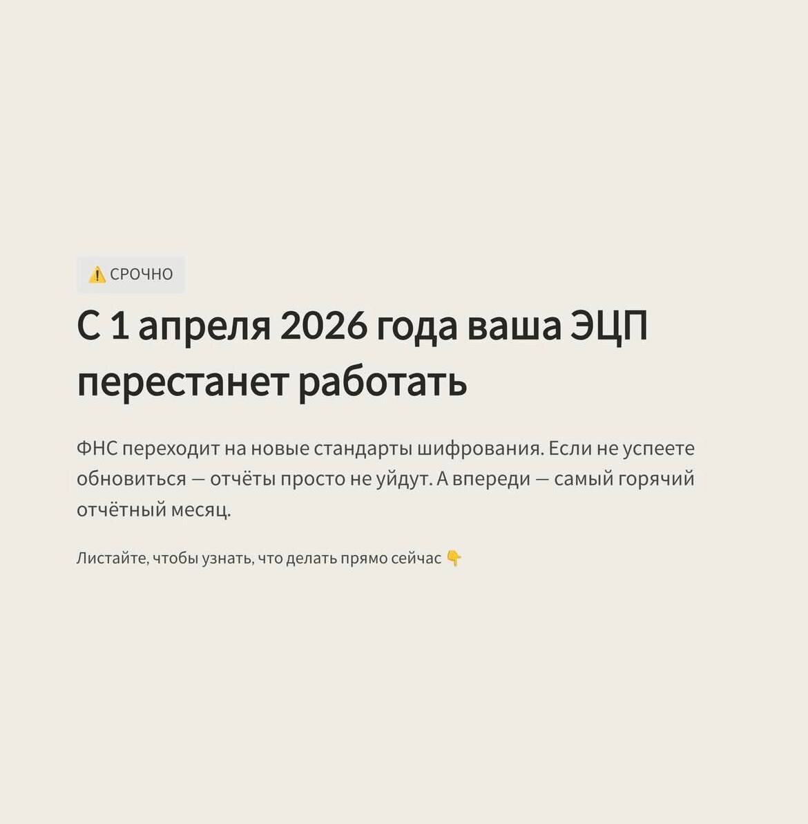 13-2018. И если программное обеспечение и электронная подпись не попадают под новые стандарты — то отчеты просто не уйдут! А ведь впереди месяц отчетов! Итак, 1. Программа для шифрования (КриптоПро CSP) должна быть версии 5.0.12000 или выше. Старые версии 4.0 R2, R3 и 4.0 R4 с 1 апреля работать не будут. 2. Сам носитель с электронной подписью (токен) должен поддерживать новые алгоритмы. Например, модель Рутокен ЭЦП 2.0 работать не будет точно. Ее надо заменить на Рутокен ЭЦП 3.0. Важно! ❗ Для подписи руководителя или ИП — перевыпустить сертификат в ФНС на новый носитель. ❗ Подпись сотрудника можно скопировать со старого токена на новый — перевыпускать сертификат не нужно. Как проверить! 1. Скачайте «Мастер настройки рабочего места» с сайта ФНС или вашего оператора ЭДО. 2. Запустите программу. 3. Посмотрите на результаты. Программа покажет: ✔ Версию КриптоПро CSP (должна быть 5.0.12000 или выше) ✔ Модель токена ✔ Наличие всех драйверов Если где-то красный крест — значит под н