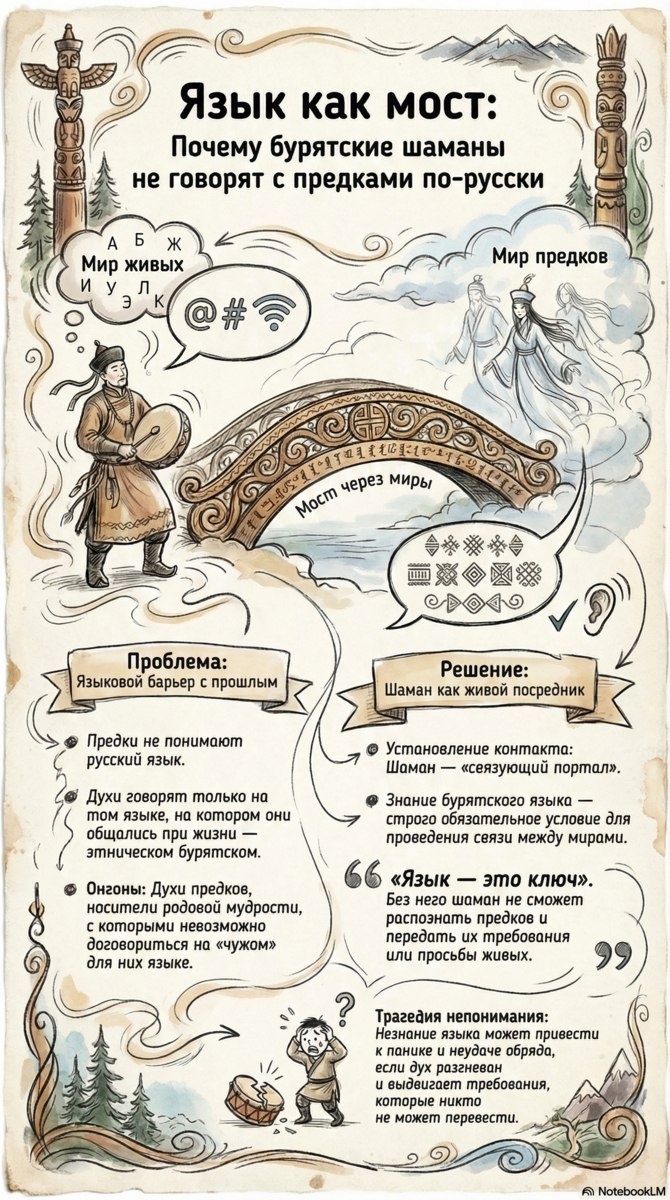 Между миром живых и миром предков существует языковой барьер. Духи (онгоны) являются носителями родовой мудрости и говорят исключительно на том языке, на котором общались при жизни — этническом бурятском. Они не понимают русский язык, и договориться с ними на «чужом» наречии невозможно. В этой системе шаман выступает как «связующий портал» и живой посредник. Знание бурятского языка является строго обязательным условием для проведения связи между мирами. Язык — это ключ, без которого невозможно распознать предков или передать их требования живым. Трагедия непонимания и незнание языка могут привести к панике и неудаче обряда: разгневанный дух может выдвинуть условия, которые никто не сможет перевести. Только знание родного языка обеспечивает устойчивый мост через миры. Канал нашей студии https://t.me/chimitdorzhi_studio