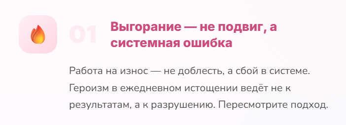 Я раньше думала, что выгорание случается с теми, кто просто не умеет собраться. А потом сама вошла в это состояние так, что еле смогла выбраться. И я поняла одну важную штуку, что выгорание вообще не про слабость или отсутствие силы воли. Выгорание про то, что в жизни что-то не так.