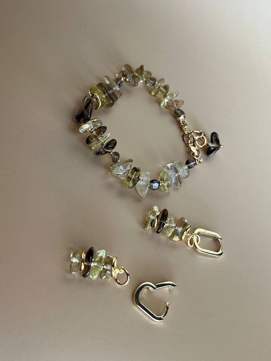 Серьги и браслет Этот комплект — как тёплый вечер в золотых оттенках: мягкий лимонный цитрин играет на свету, переливаясь нежными медовыми искрами, а в центре — глубокий, загадочный дымчатый кварц, будто хранит в себе спокойствие и силу земли. Браслет собран вручную, с вниманием к каждой детали — живые, неровные формы камней создают ощущение природной гармонии и естественной красоты. Серьги — трансформеры: можно менять настроение и стиль. Сегодня — лаконично, завтра — акцентно ✨ Этот комплект — единственный в своём роде. Цитрин для него был найден на ярмарке и выбран под заказ — тот самый, «с характером», который больше не повторится. Украшение для тех, кто любит уникальность, тепло и вещи с историей 💛