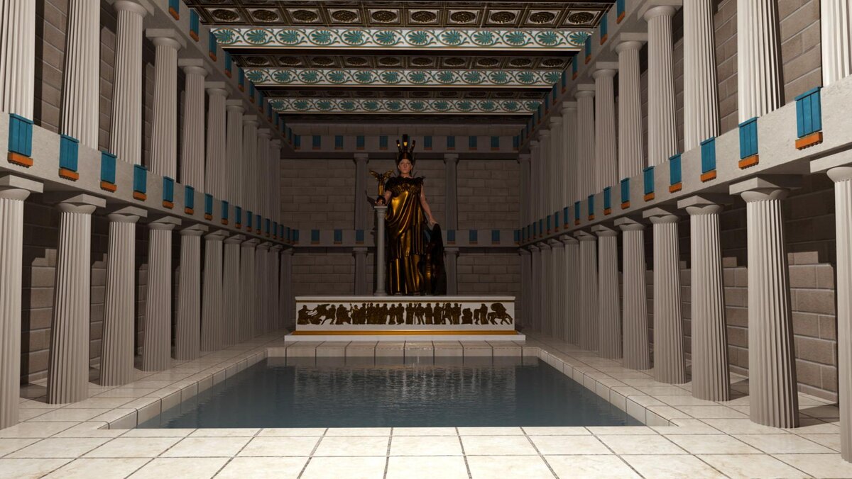 В середине V века до н. э., в эпоху расцвета Афины, на Акрополе был возведён Парфенон - не просто храм, а демонстрация могущества, богатства и амбиций полиса. Его центральным сокровищем стала гигантская статуя богини Афина Парфенос, созданная величайшим скульптором античности - Фидий. Статуя Афины Парфенос (447–438 гг. до н. э.) поражала не только размерами, но и технологией исполнения. Её высота достигала примерно 12–13 метров, и она была выполнена в так называемой хризоэлефантинной технике - сочетании золота и слоновой кости. Внутри находился деревянный каркас, на который крепились пластины из драгоценных материалов: лицо и руки богини из слоновой кости, одежда и доспехи - из чистого золота. Афина изображалась как воительница и покровительница города. В одной руке она держала статую богини победы Ники, в другой - щит. На её груди был эгид с головой Медузы, а рядом располагалась змея - символ защиты и древней силы. Каждая деталь имела значение, превращая скульптуру в сложный политичес