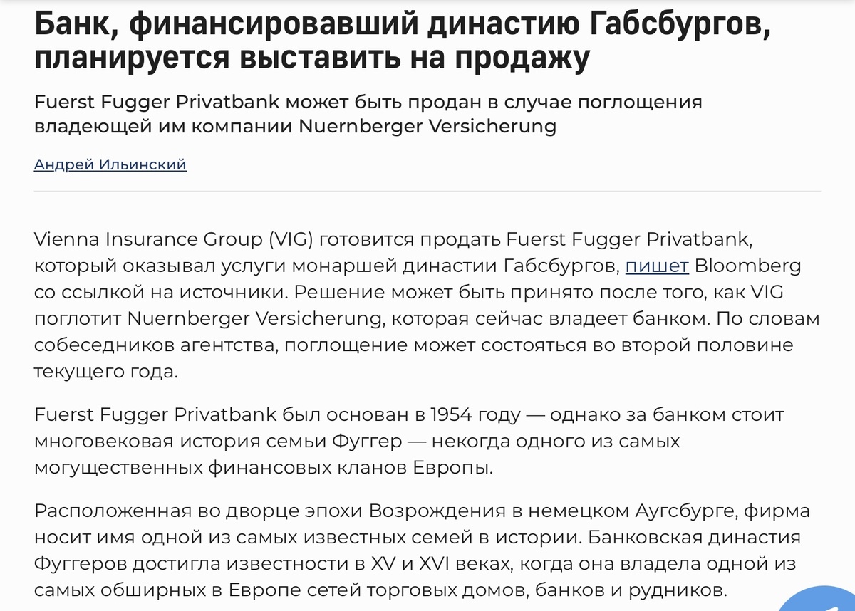 Frankmedia написало интересную статью о продаже «легендарного» банка Фуггеров: Заголовок для статьи придумали в стиле современной бизнес-журналистики: «Слышал звон, да не знает, где он» Здесь стоит отметить, что семья банкиров Фуггеров действительно легендарная. При этом о ней у нас мало, кто знает. Из исторических банкиров очень хорошо знают Ротшильдов и много о них говорят. Меньше, но все же говорят о Медичи, а вот Фуггеры практически неизвестны. Активно работавшие в XV-XVI веках, Фуггеры скорее всего были самыми богатыми предпринимателями-банкирами в истории Европы в относительном выражении. Их состояние составляло где-то 2% ВВП Европы. Для сравнения у Медичи было 0.1%. А у Ротшильдов - 1%. Пик могущества Фуггеров пришелся на Якоба Фуггера, у которого было прозвище Богатый (Jacob Fugger der Reiche). Финансирование монархов из династии Габсбургов, сделавших Фуггеров сверхбогатыми, в итоге и погубило банкиров.