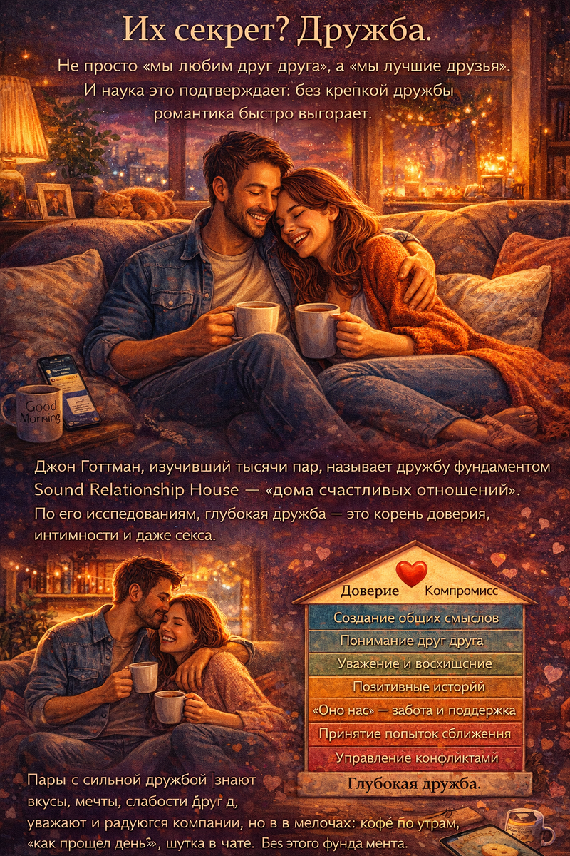 Представьте пару, которая вместе уже 15 лет. Они не устраивают ежедневных сцен ревности, не дарят цветы каждый месяц, но могут часами болтать о глупостях, смеяться над старыми шутками и молча понимать, когда другому плохо. Их секрет? Дружба. Не просто «мы любим друг друга», а «мы лучшие друзья». И наука это подтверждает: без крепкой дружбы романтика быстро выгорает. Джон Готтман, изучивший тысячи пар, называет дружбу фундаментом Sound Relationship House — «дома счастливых отношений». По его исследованиям, глубокая дружба — это корень доверия, интимности и даже секса. Пары с сильной дружбой знают вкусы, мечты, слабости друг друга, уважают и радуются компании. Они выражают нежность не только в постели, но и в мелочах: кофе по утрам, «как прошёл день?», шутка в чате. Без этого фундамента даже страсть не спасает — она превращается в рутину или конфликт. Почему дружба так важна именно в романтике? Страсть — это вспышка: дофамин, окситоцин, адреналин. Она длится от 6 месяцев до 2–3 лет. А