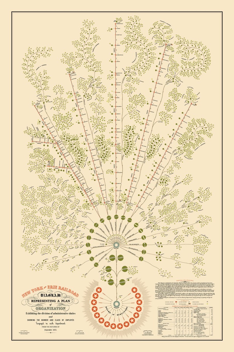 Нашел потрясающий артефакт — оригинал одной из первых организационных схем в истории (рассмотреть в деталях). Ее создал Дэниел МакКаллум в 1855 году, когда возглавлял Нью-Йоркско-Эрийскую железную дорогу. Позже, в 1862-м, его опыт масштабировали на все железные дороги США. В те годы железные дороги были самым сложным бизнесом в истории человечества. Тысячи сотрудников, сотни миль путей и постоянные аварии требовали нового подхода. МакКаллум понял: чтобы управлять такой махиной, нужно визуализировать иерархию и потоки информации. Она была далека от современных строгих квадратов и больше напоминала ботаническую иллюстрацию. В самом низу, в корнях, находились Президент и Совет директоров. Это была глубокая метафора: МакКаллум считал, что руководство — это фундамент, который питает всю систему, а не вершина, которая на неё давит. Схема работала одновременно и как оргструктура, и как карта. Ветви — подразделения: Каждая крупная ветвь соответствовала одному из пяти операционных подразделен