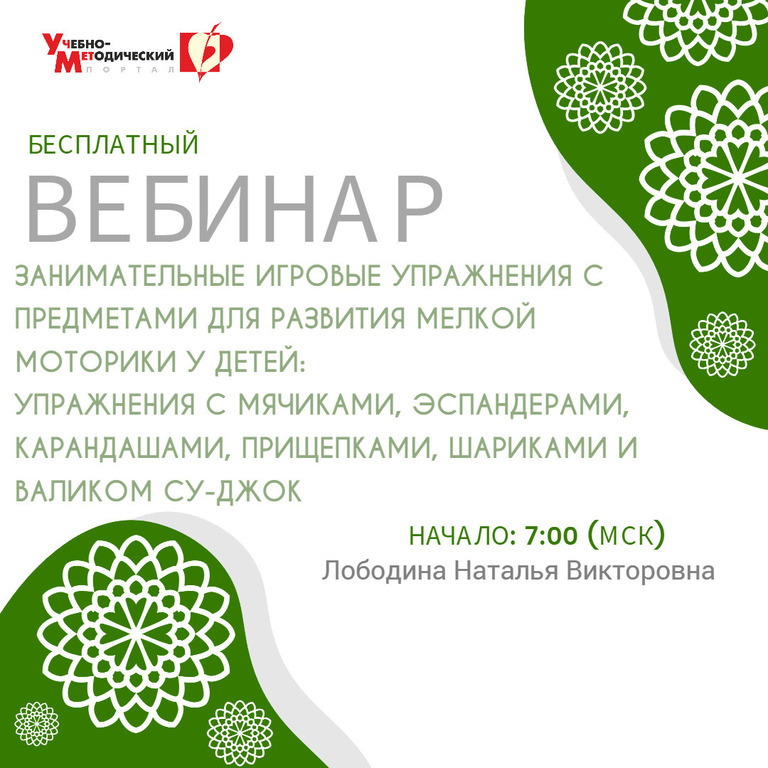 , карандашами, прищепками, шариками и валиком Су-Джок» Дата проведения: 24.03.2026 Начало: 7:00 (МСК) https://www.uchmet.ru/events/item/4070303/ На вебинаре слушатели вместе с ведущим рассмотрят классификацию и принцип подбора занимательных игр и упражнений с предметами для развития мелкой моторики у детей дошкольного возраста. Содержательные вопросы вебинара: 1. Значение игровых упражнений с мелкими предметами для развития мелкой моторики ребенка. 2. Педагогические условия проведения игр с предметами как средства развития речи детей дошкольного возраста. 3. Принцип подбора занимательных игр и упражнений с предметами для развития мелкой моторики ребенка. 4. Классификация игровых упражнений с предметами для развития мелкой моторики у детей. 5. Игровые упражнения с мячиками разных размеров, эластичными резинками, эспандерами, бусинами, карандашами. 6. Игровые упражнения с прищепками, шариком, аппликатором Кузнецова и валиком Су-Джок. Ведущий вебинара: Лободина Наталья Викторовна, учит
