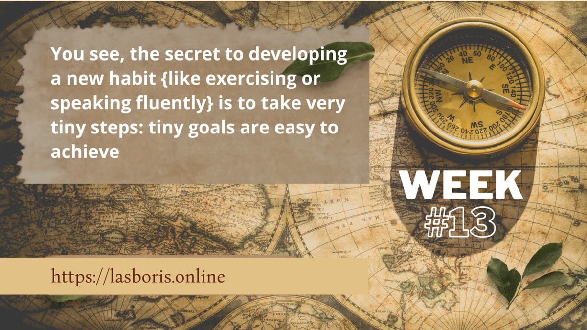 🗓 Всем привет! И новой продуктивной недели! 🙌 Для моих учеников фраза тринадцатой недели: WEEK 13 You see, the secret to developing a new habit {like exercising or speaking fluently} is to take very tiny steps: tiny goals are easy to achieve. Большие изменения начинаются с маленьких шагов. Главное — не торопиться. Язык — это навык, который развивается постепенно. Enjoy this fulfilling week, everyone. Наш девиз по-прежнему TRAINING. PRACTICE. MOTIVATION. 📚 Приглашаю вас. 💡 ЗАПИСАТЬСЯ НА КУРС АНГЛИЙСКОГО ОНЛАЙН 👨🎨 supa-lasboris