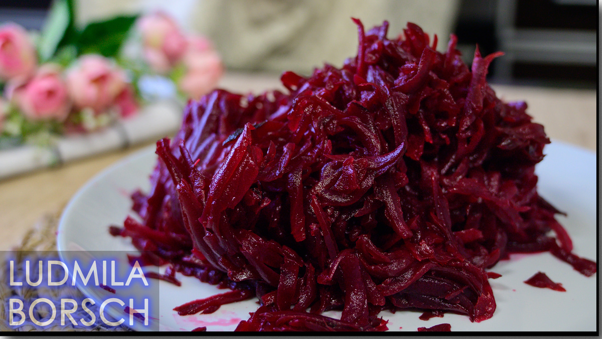 «Друзья, а теперь давайте покажу вам лёгкий, яркий и невероятно вкусный салат — настоящий взрыв свежести и цвета на тарелке! Свекла, хрустящие огурчики, красный лук — всё это заправлено ароматной заправкой. Готовится за считанные минуты, а съедается ещё быстрее. Поехали! Сначала берём отварную свеклу — лучше всего, если она остыла, так удобнее работать. Очищаем её от кожуры! Теперь трём на крупной или средней тёрке — получаем красивую, пушистую свекольную стружку. Отправляем всю эту красоту в глубокую миску. Дальше солёные огурцы — берём крепкие, хрустящие, и нарезаем. Можно кубиками, можно тонкими полукружочками — как вам больше нравится по текстуре. Я люблю, когда огурцы дают приятный контраст свекле, поэтому режу их не слишком мелко. Выкладываем в миску к свекле — как аппетитно сочетаются цвета! Теперь красный лук — он добавит лёгкую остроту и красивый фиолетовый акцент. Очищаем, режем очень тонкими полукольцами или мелким кубиком — кому как удобнее. Чтобы убрать лишнюю горечь, можн