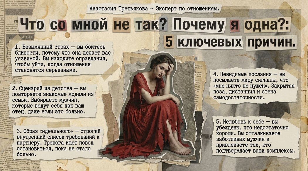 Ко мне часто обращаются клиентки с вопросом «Что со мной не так? Почему я одна?». Они описывают усталость от ожидания, острое чувство своей «неправильности» и нарастающий страх, что любовь уже прошла мимо навсегда. В этой статье я рассмотрю 5 ключевых причин, почему умные, красивые и искренние женщины раз за разом остаются без пары. И почему дело совсем не в том, что с ними «что-то не так». «Мне 34. Работа есть, подруги есть, жизнь есть. Я слежу за собой, стараюсь быть открытой и доброй. Но я одна уже три года. Смотрю на других и не понимаю: как им это даётся так легко? Начинаю думать может, я слишком сложная? Недостаточно красивая? Или просто не везёт? Честно говоря, уже не знаю, что думать о себе». Причина 1. Страх без имени Многие женщины искренне хотят отношений. И одновременно боятся их. Не осознанно, а где-то глубоко внутри. Одна из моих клиенток говорила, что мечтает о любви, но каждый раз, когда отношения становились серьёзнее, она находила повод уйти. «Он не тот», «что-то не т