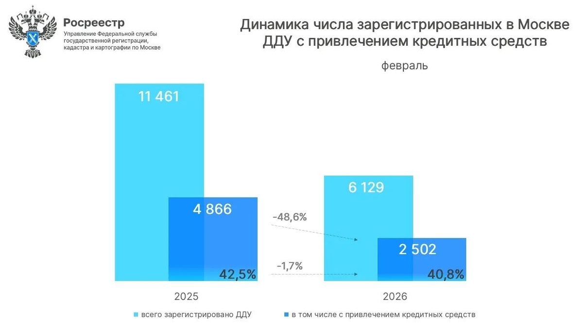 В феврале 2026 года Росреестр зарегистрировал 2 502 ДДУ с привлечением кредитных средств. 🔵 Год к году показатель снизился на 49% — в феврале 2025-го было 4 866 сделок. При этом доля ипотечных сделок почти не изменилась и уступила прошлому году всего 1,7 п.п.