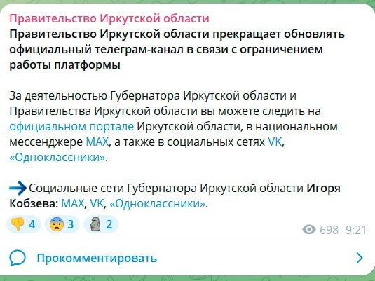 Правительство Иркутской области во главе с губеррнатором Игорем Кобзевым («Единая Россия») прекратило обновлять свой канал в телеграме, у которого почти 11 тыс. подписчиков. Чиновники объяснили решение «ограничением работы платформы». При этом уже после публикации правительства отдельный комментарий вышел в телеграм-канале самого Кобзева, у которого более 100 тыс. подписчиков. Он назвал одним из приоритетов своей работы «быть на постоянной связи» с жителями. «Чтобы не потерять коммуникацию, я принял решение большую часть информации публиковать только в официальных мессенджерах и соцсетях. Сейчас это MAX, VK и Одноклассники», — написал Кобзев. Что единоросс Кобзев имеет в виду под «официальными» мессенджерами и соцсетями, не уточняется. Напомним, что MAX, VK и «Одноклассники» принадлежат частным структурам. За пару часов пост Кобзева в «Одноклассниках» набрал два лайка. 📌 Некоторые жители уже высмеяли поведение Кобзева в комментариях к его посту. Люди опасаются, что власти окончат