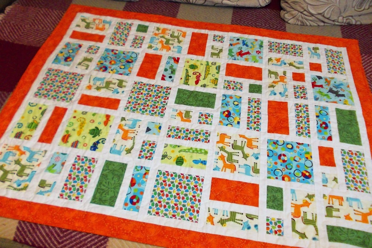 Хочу сегодня показать вам, как сшить детское одеялко просто из цветных квадратов и прямоугольников. Шила я его давно, и даже было описание где-то в Интернете. Но тогда я его не сохранила, а теперь не нашла. На самом деле, принцип, использованный в этом одеяле, широко применяется для одеял любого размера. Только вид блоков меняется. А началось всё с двух кусочков тканей детских расцветок размером 45х50см, которые мне подарили. И, как вы понимаете, сшить из него можно было только что-то детское. Но даже на детское одеяло этих тканей, конечно же, не хватало. Пришлось докупить две ткани с таким же детским рисунком и два вида однотонных тканей, подходящих по цвету. Ну и, конечно, добавить белую фоновую. Мне вообще нравятся детские одеяла именно с белой фоновой: она добавляет лёгкости... Схему одеяла выбрала следующую: Как вы видите, здесь только квадраты и прямоугольники. Размер блока для изделия я выбрала 6" (15см) в готовом виде. Часть блоков представляют из себя просто целые квадраты, а