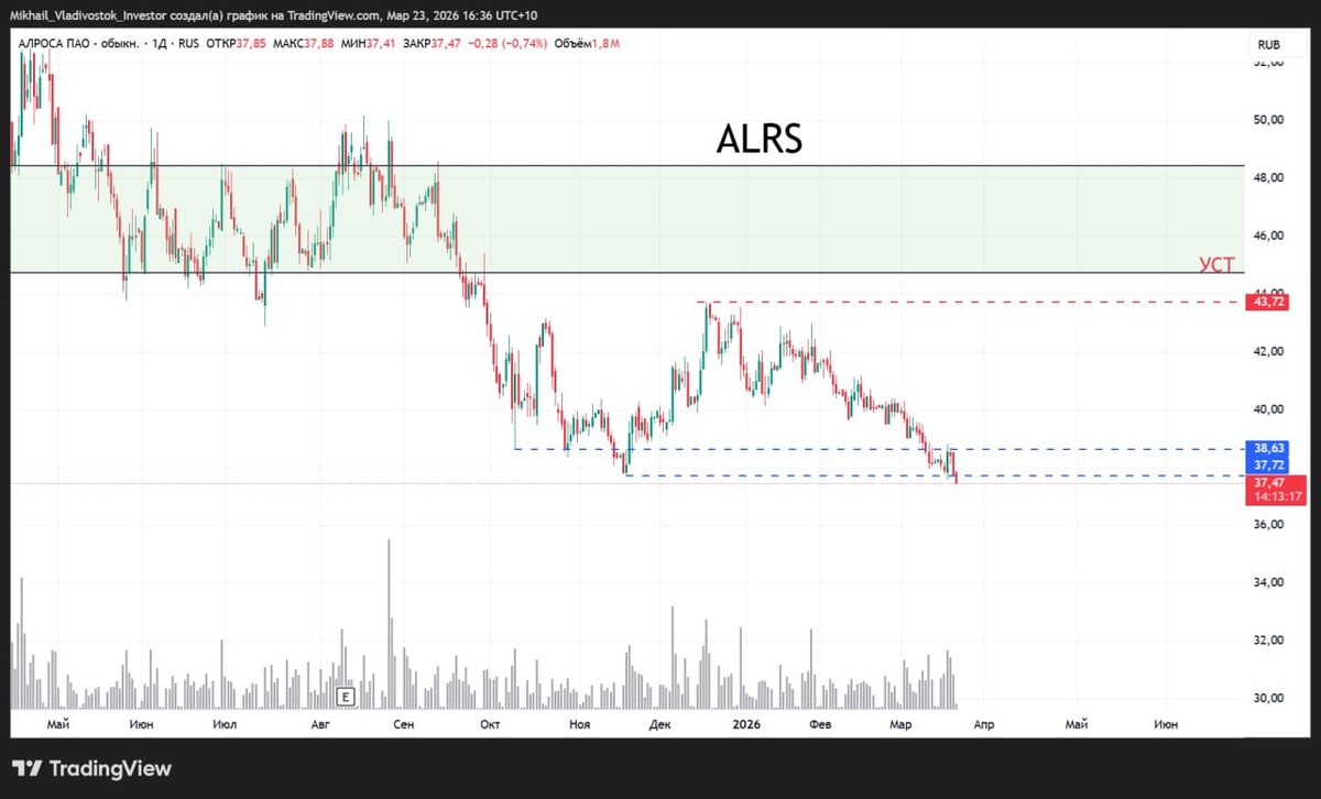 Алроса $ALRS пробила минимум 37,72. Если закрепляемся, то летим ниже. Можно искать шорты. Поддержек дальше нет