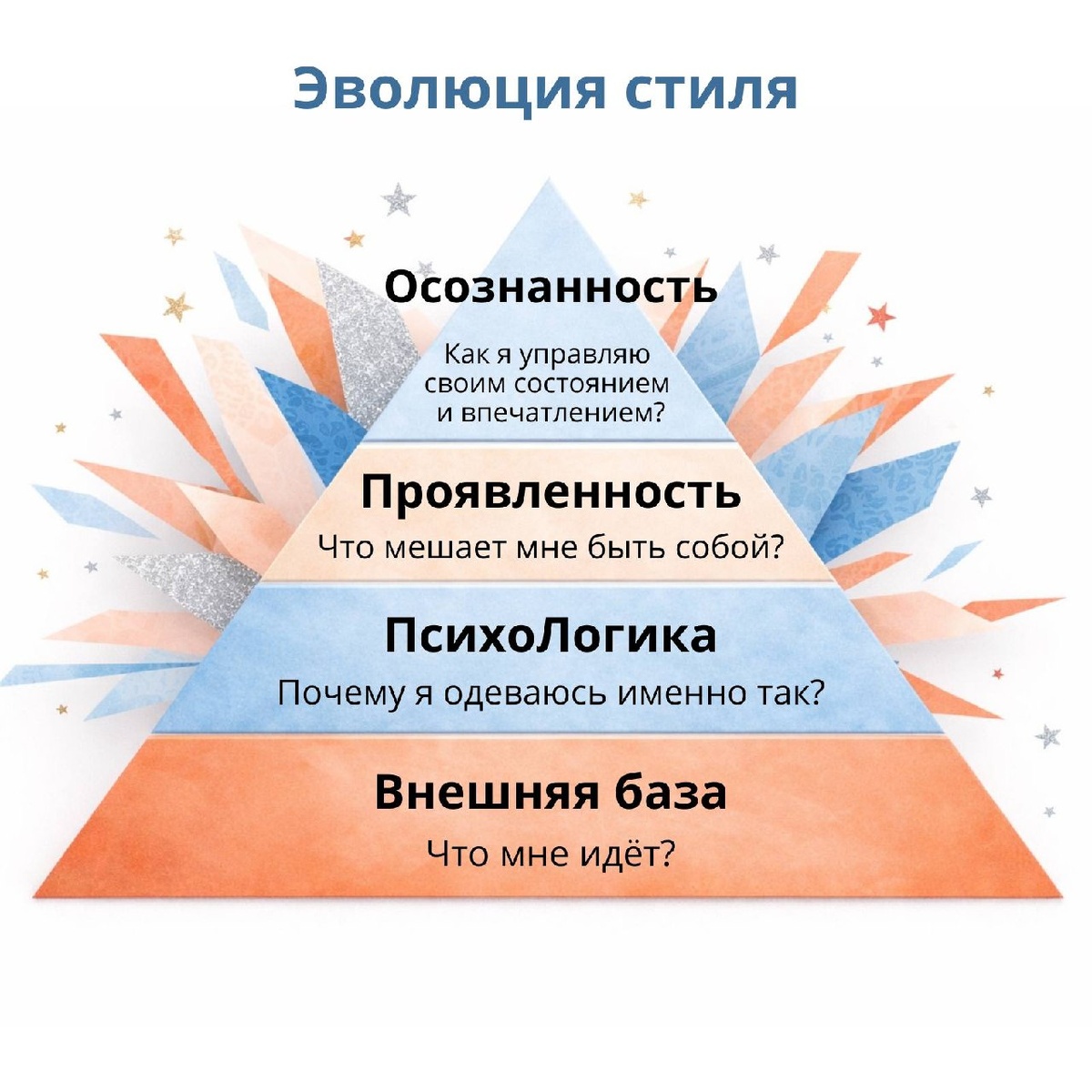 Особенности фигуры, цвета, базовый гардероб – это всё важно, но лишь начало пути. Освоив навык «скрыть недостатки, подчеркнуть достоинства», ты сперва наслаждаешься новыми оттенками зеленого в гардеробе, и первые казаки в гардеробе вызывают овуляцию, а прием с платком на пояс вообще создает настроение «королева бала в рот вас всех е*ла». Спустя время этого становится мало. Не цепляет. Не дает энергии. Почему? Потому что пора идти на следующие уровни. Давай расскажу про эти самые уровни, по которым развивается стиль: 1. Внешняя база. То самое «Что мне идёт?» Оливковый свитер подчеркнет глубину твоих глаз, а брюки с высокой талией красиво скроют круглый животик. Тут без стилистов не обойтись никак. Если нужно, попозже расскажу, какие русскоговорящие стилисты меня вдохновляют. И у кого из них я была клиентом. 2. Психологическая логика (ПсихоЛогика). «Почему я одеваюсь именно так?» Однажды меня просили: «Света, почему ты сегодня в этой оверсайз халабуде? Почему талию не подчеркнешь?