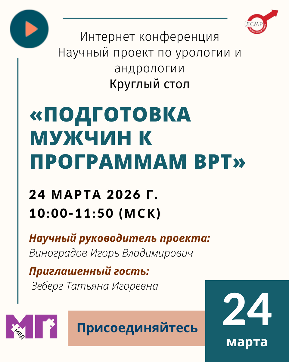 Уважаемые коллеги, приглашаем вас принять участие в круглом столе «Подготовка мужчин к программам ВРТ» Дата и время проведения: 24 марта 2026 г., 10:00-11:50 (МСК) Научный руководитель проекта: Виноградов Игорь Владимирович — д.м.н., профессор, врач уролог – андролог, научный руководитель НПЦ «Репродуктивной и регенеративной медицины», Председатель Лиги специалистов мужской репродукции, г. Москва Приглашенный гость: Зеберг Татьяна Игоревна — к.м.н., врач-репродуктолог, заведующая отделением Репродукции и лечения эндометриоза, Клиника «Линия Жизни», Москва Программа мероприятия: 10:00 -10:05 Приветствие 10:05-10:35 «Преодоление высокого уровня ФДНК сперматозоидов в программах ВРТ» Виноградов Игорь Владимирович 10:35-11:05 «Границы компетентности и преемственность в ведении бесплодной пары: взгляд репродуктолога» Зеберг Татьяна Игоревна 11:05-11:35 «Криоконсервация спермы, как этап лечения» Виноградов Игорь Владимирович 11:35-11:50 Ответы на вопросы, закрытие конференции Ссылка на транс