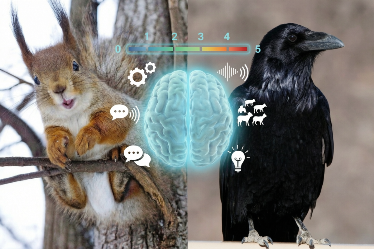 Белка — 2 балла. Мозг белки небольшой, но её коэффициент энцефализации (EQ) довольно высок для грызуна, что указывает на неплохие когнитивные способности. Однако ключевое отличие от врановых — в структуре: у белок, как у млекопитающих, интеллект обеспечивается неокортексом, и по количеству нейронов в коре (около 20–30 миллионов) они уступают не только приматам, но и некоторым птицам с их сверхплотной упаковкой нейронов. Ворон — 5 баллов. Мозг ворона небольшой по объему, но он обладает чрезвычайно высокой плотностью нейронов. В гиперпаллиуме (аналоге коры головного мозга у млекопитающих) нейроны упакованы гораздо плотнее, чем у приматов. Более того, у вран