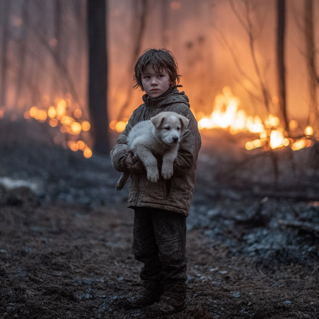 Эта картина казалась сюрреалистичной на фоне выжженной земли. У парня обгорела одежда, но и он, и животные были живы.