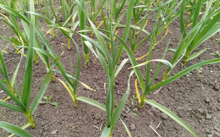 Как только озимый чеснок показывает хвостики, пора приступать к уходу за ним – рыхлить почву и давать первую подкормку. «Рыхление — обязательное мероприятие после зимы, — говорят специалисты. — Это помогает сохранить влагу и обеспечить доступ кислорода к корневой системе. Если опоздать с рыхлением, на поверхности образуется корка, которая со временем затвердеет, образуются трещины, влага испаряется быстрее в разы». Чтобы чеснок рос здоровым, перья после зимы набирали силу и не желтели, формировались крупные головки, ему нужно достаточное количество азота, фосфора, калия и других микроэлементов. Поэтому без подкормок никак. Первую проводим посте таяния снега, когда земля подсохла и сформировалось перо. Карбамид (мочевина) в большом количестве содержит азот. Используется так: в 10 л воды растворить 1 столовую ложку мочевины. Такой раствор используется для полива площади в 1 кв. м. Вторая подкормка через две недели после первой комплексными минеральными удобрениями. Нитрофоска или Нитроам