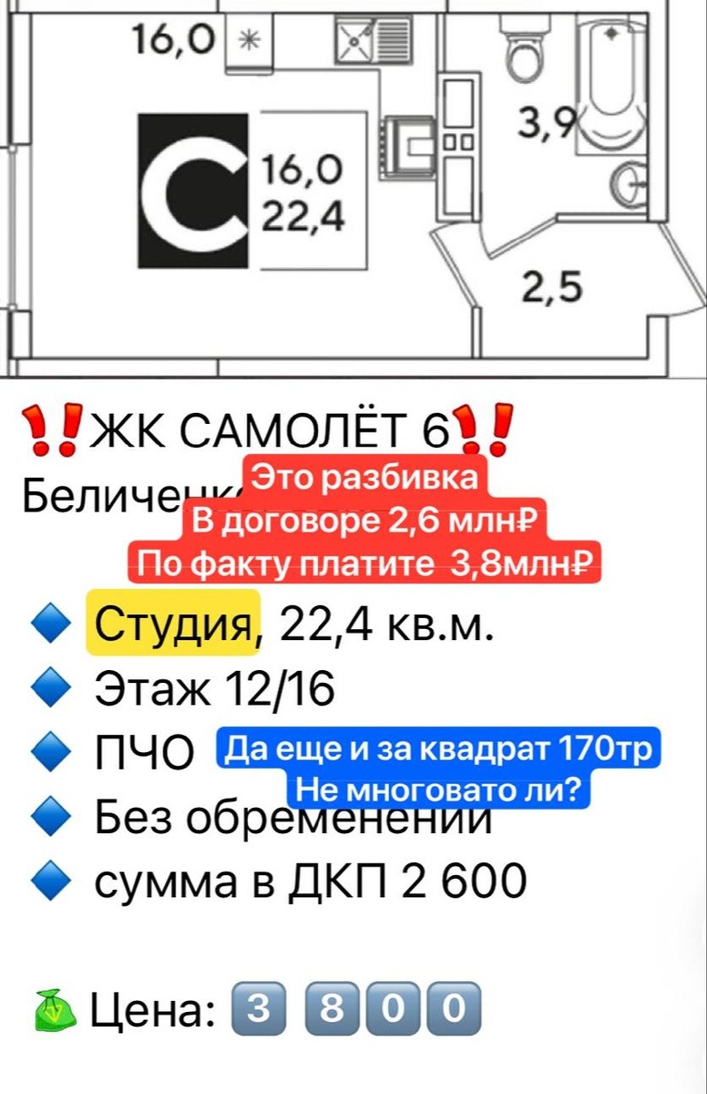 Реальность рынка такова… Сейчас делаю подборку для клиентки в одной из самых перспективных локаций города. Там, где в ближайшие годы появится большая точка притяжения с термальным комплексом. И вот что вижу по цифрам. --- Новостройка от застройщика: — 23 м² — 3 600 000 ₽ — чистая сделка — дом сдан — можно сразу делать ремонт и сдавать --- Вторичка рядом: — 18 м² — 3 250 000 – 3 400 000 ₽ — и начинается самое интересное То, о чём вам никто не скажет. Часто такие квартиры продаются с «разбивкой»: — часть суммы в договоре — часть «в руки» Например: в договоре будет 2600 000 ₽, а реально платите 3 800 000+ Что это значит для вас: — вы официально не защищены на полную сумму — при спорах возвращается только сумма из договора — банк может не одобрить сделку — риски — полностью на вас --- Теперь добавим ещё один слой. Квартира в обременении. Если у продавца долг, например, 1 000 000 ₽, то схема обычно такая: — вы даёте задаток (закрываете его долг) — он гасит ипотеку — тол