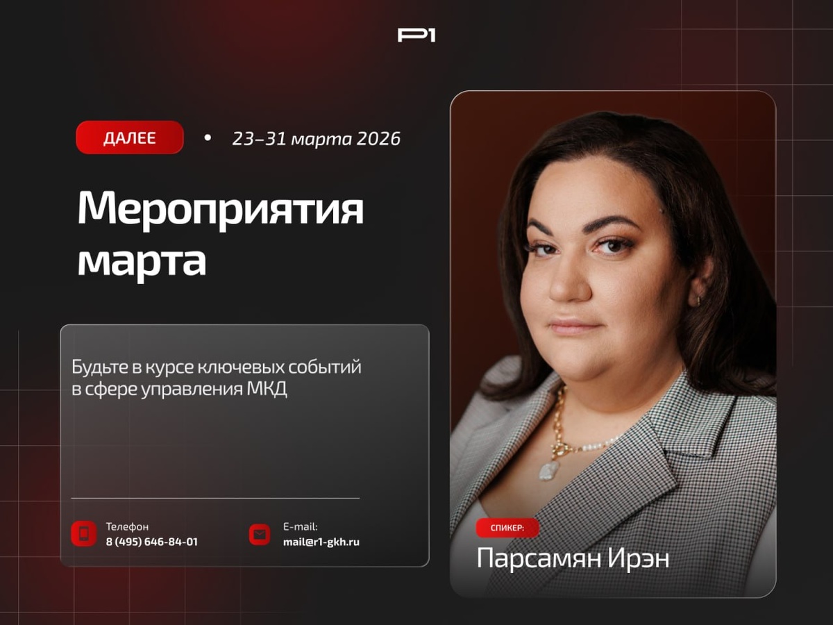 Собрали для вас ключевые события конца месяца – присоединяйтесь к встречам, следите за событиями и задавайте вопросы. 1️⃣ 24 марта – Ирэн Парсамян на семинаре ассоциации «РСО "ЖКХ Удмуртии"» в Ижевске. Спикер разберёт последние изменения в законодательстве и требования к годовому отчёту по новой форме Минстроя РФ. 2️⃣ 27 марта, 10:00 – групповая консультация с Ирэн Парсамян для членов Ассоциации «Р1». На групповой консультации «Ответственность по ГИС ЖКХ по срокам, содержанию и объёму» узнаете, как избежать штрафов по срокам, содержанию и объёму данных и выстроить работу в системе без рисков. 3️⃣ 31 марта – Ирэн Парсамян на семинаре «Работа УО в национальном мессенджере МАХ». На мероприятии от Учебно-методического центра Жилищного комитета Санкт-Петербурга исполнительный директор объединения расскажет, как выстроить цифровые коммуникации. 🎚 А также ➡️ 🔲 Идёт регистрация на VI Весеннюю конференцию по управлению МКД «Адаптация бизнеса под новые реалии» 21–23 мая в Кисловодске.