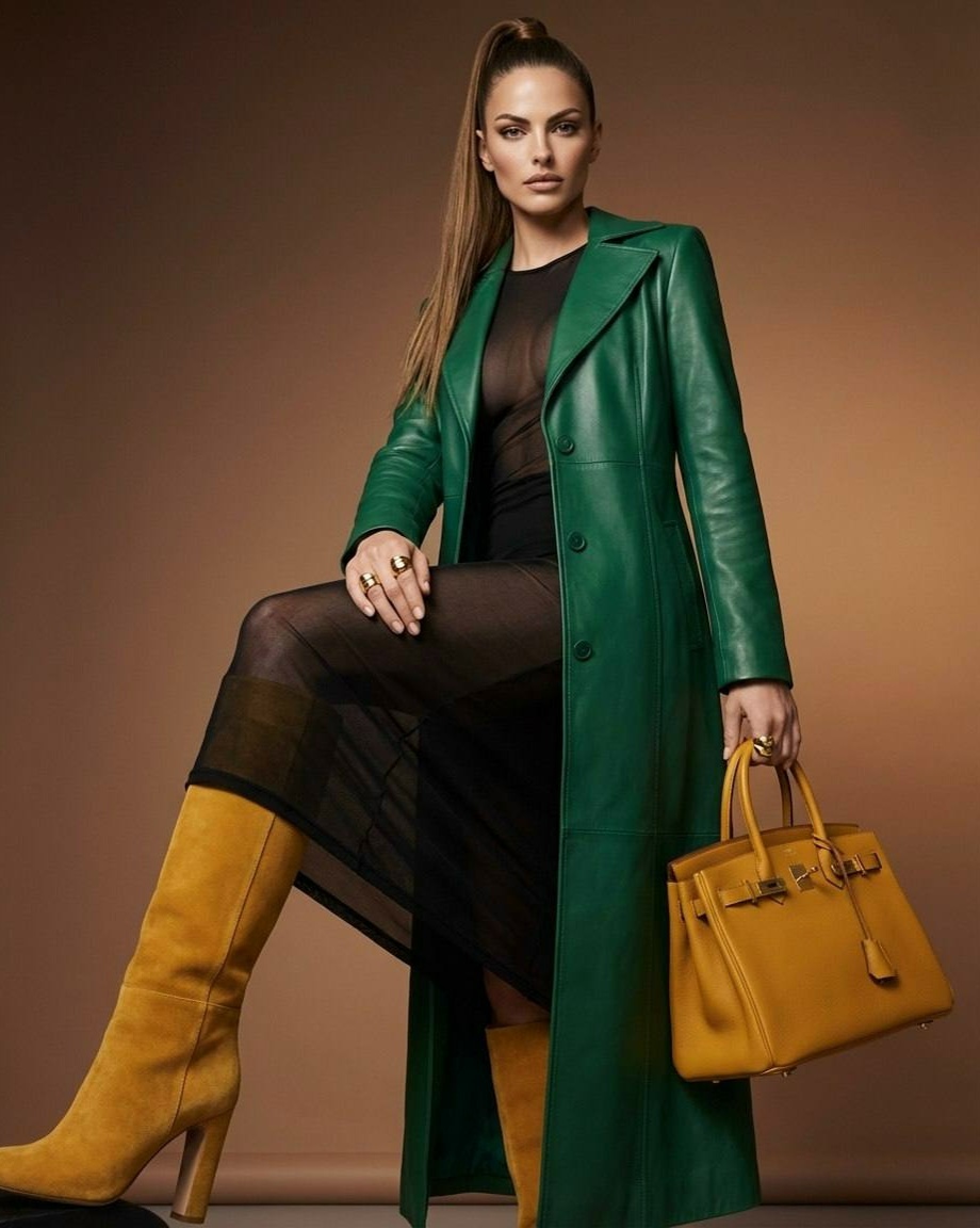 1) Заходим в БОТ ВК или БОТ ТГ 2) Жмем Выбор модели => Nano Banana PRO/Nano Banana 2 3) Добавляем свой фото (важно фото БЕЗ ретуши и любой обработки и фильтров), вставляем этот ПРОМТ: Создайте гиперреалистичное роскошное рекламное фото модной женщины, уверенно позирующей в студии. Она одета в длинное зеленое кожаное пальто модной коллекции 2027 года поверх облегающего прозрачного платья черного цвета. Одна нога поднята вперёд в мощной уверенной позе, подчёркивающей высокие элегантные сапоги на каблуке из замши горчичного цвета .