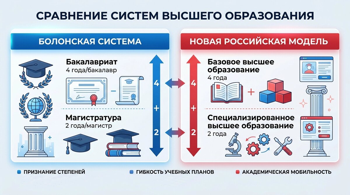 С 2023 года российские университеты внедряют инновации: единое содержательное ядро и обновлённые учебные планы. С 2026 года в России вводится трёхуровневая система высшего образования (базовое, специализированное и аспирантура), заменяющая Болонскую модель. Реформа делает акцент на единых стандартах обучения, цифровизации и тесной связи вузов с реальным сектором экономики через стажировки и целевой набор.