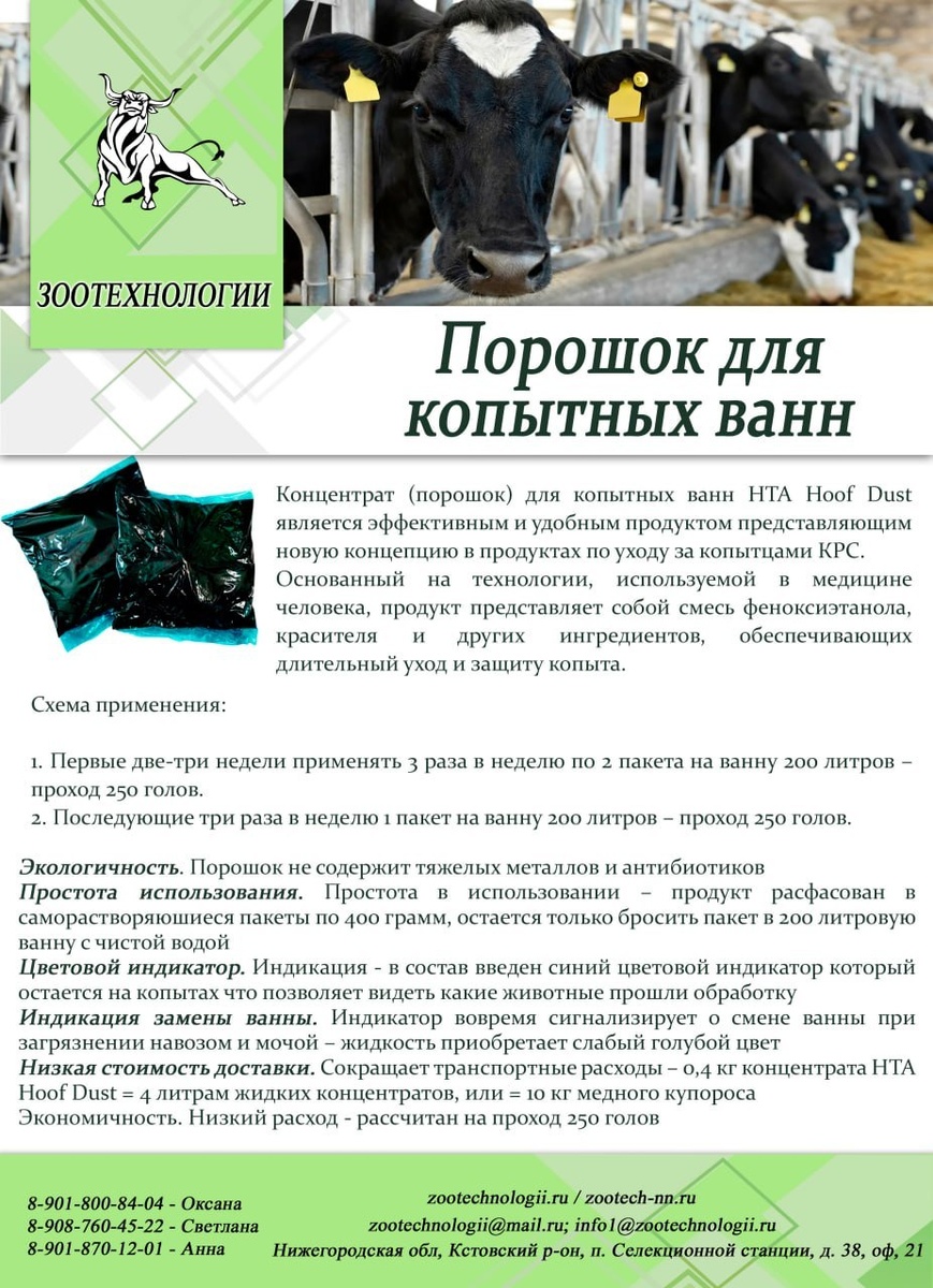 🍀 В продаже порошок для копытных ванн HTA Hoof Dust, который предназначен для ухода и защиты копыт сельскохозяйственных животных, в частности коров. 💦 Средство обеспечивает длительную гигиену копыт, не содержит тяжёлых металлов и антибиотиков. В состав включён синий цветовой индикатор, который остаётся на копытах и позволяет видеть, какие животные прошли обработку. ⚙️ Схема применения: первые две-три недели — 3 раза в неделю по 2 пакета на ванну объёмом 200 литров (рассчитано на проход 250 голов). В последующие три раза в неделю — 1 пакет на ванну объёмом 200 литров. 🐄 Частота обработки зависит от количества коров с проблемами копыт и чистоты в коровнике. При благоприятных условиях — 2 раза в неделю, при неблагоприятных — ежедневно. Оставить заявку можно у наших менеджеров: Оксана: 8-901-800-84-04; 8-908-760-45-22 Светлана : 8-908-742-37-86 Анна: 8-901-870-12-01 Юлия: 8-902-787-47-33 Будь