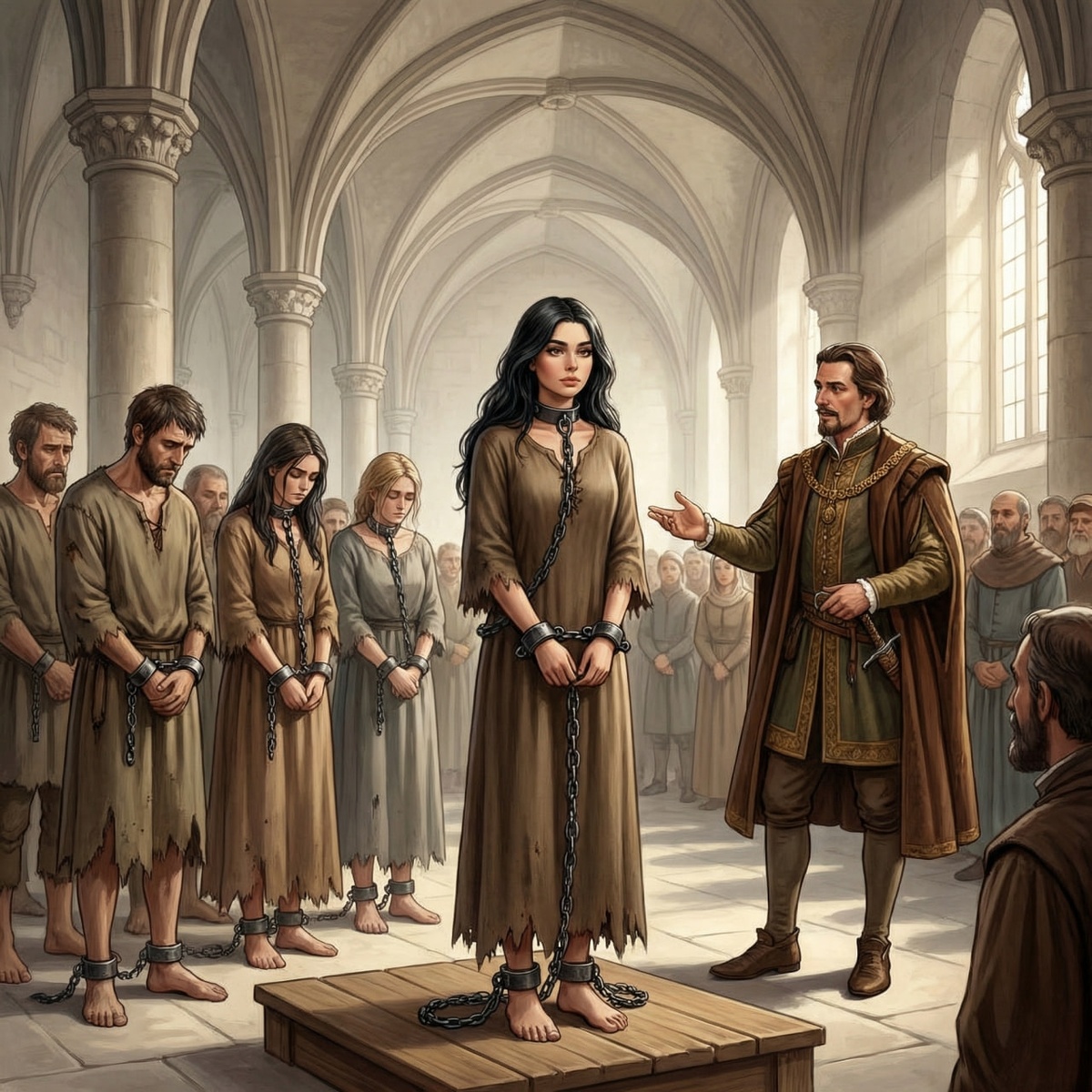 Когда назвали моё имя, я подняла глаза и увидела его. Не того рыжего, который смеялся громче всех, и не мужчину с бумагами, а другого - черноволосого, который делал вид, будто читает, и даже не смотрит, будто бы вообще не участвует. Он не улыбается, не торгуется. Но когда меня вывели, он поднял голову, и внутри у меня будто что-то щёлкнуло. Узнавание, которое невозможно объяснить. Он сказал: “забираю”, и внутри стало холодно и… странно тихо. Ну, здравствуй, новая форма клетки.
