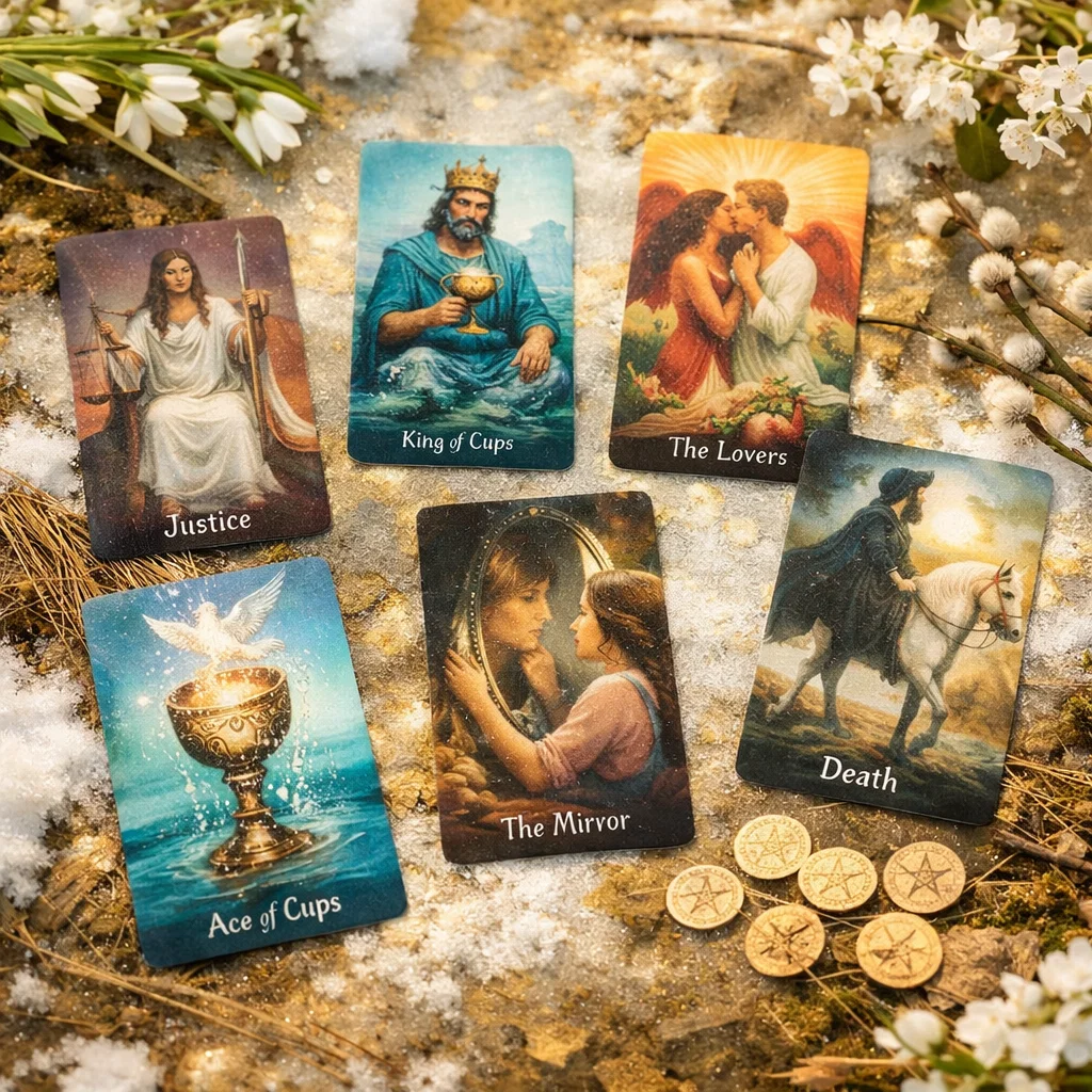 Карты расклада: Правосудие, Король Кубков, Туз Кубков, Влюблённые, Смерть, Зеркало, Восьмёрка Пентаклей.