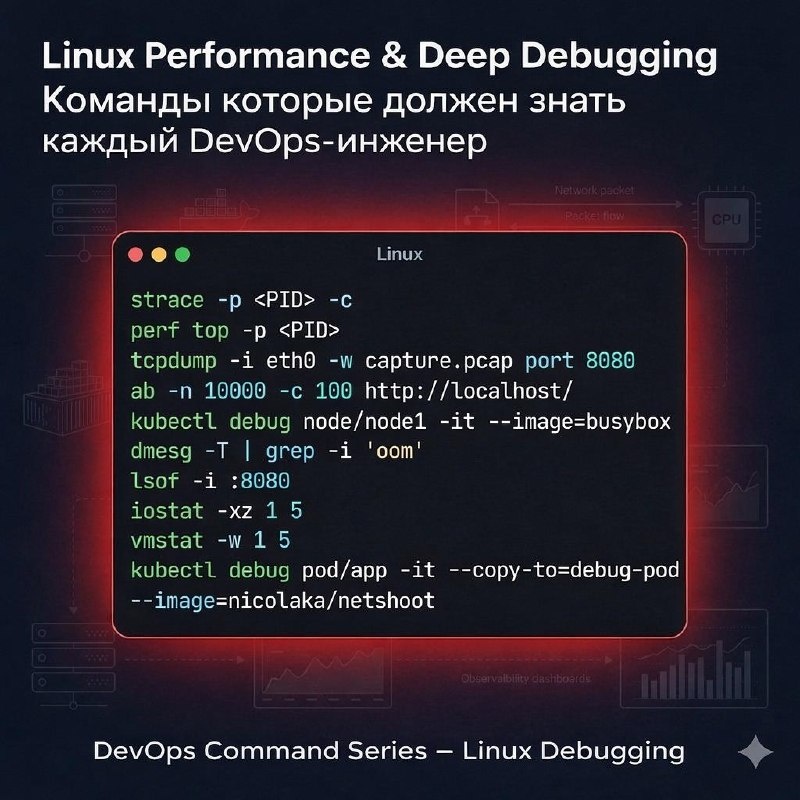 Когда дашборды уже не помогают - ты идёшь в ОС. Вот 10 команд, которые реально используют в продакшн-инцидентах: 1. strace -p <PID> -c → трассирует системные вызовы процесса и показывает, на чём он завис 2. perf top -p <PID> → live-профилирование CPU, сразу видно “горячие” функции 3. tcpdump -i eth0 -w capture.pcap port 8080 → захват сетевого трафика для глубокого анализа 4. ab -n 10000 -c 100 http://localhost/ → быстрый нагрузочный тест: 10k запросов, 100 одновременно 5. kubectl debug node/node1 -it --image=busybox → подключение к ноде через временный контейнер 6. dmesg -T | grep -i 'oom' → проверка OOM kill событий ядра 7. lsof -i :8080 → какой процесс занял порт 8. iostat -xz 1 5 → статистика диска в реальном времени 9. vmstat -w 1 5 → память, swap и CPU в динамике 10. kubectl debug pod/app -it --copy-to=debug-pod --image=nicolaka/netshoot → глубокая диагностика сети внутри кластера Когда всё горит - именно эти команды спасают. Сохрани перед следующи