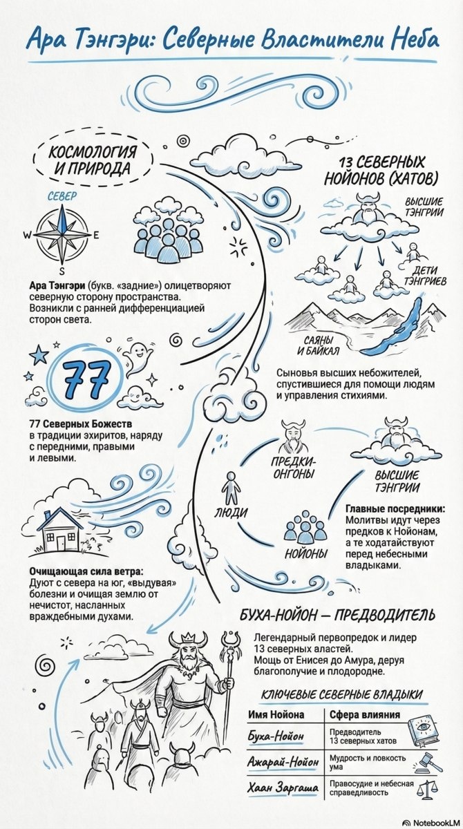 Ара Тэнгэри (буквально — «задние») олицетворяют северную сторону пространства. В традиции эхиритов насчитывается 77 Северных Божеств. Их природная сила — очищающий ветер, который дует с севера на юг, «выдувая» болезни и очищая землю от нечистот, насланных враждебными духами. Главными посредниками выступают 13 Северных Нойонов (Хатов) — сыновья высших богов, спустившиеся на Саяны и Байкал для помощи людям. Лидером 13 северных аластей является Буха-Нойон, чья мощь от Енисея до Амура дарует благополучие и плодородие. Ключевые владыки: Буха-Нойон: Предводитель и лидер. Ажарай-Нойон: Покровитель мудрости и ловкости ума. Хаан Заргаша: Страж правосудия и небесной справедливости. Молитвы людей передаются через предков-онгонов к Нойонам, которые ходатайствуют перед небесными владыками. Канал нашей студии https://t.me/chimitdorzhi_studio