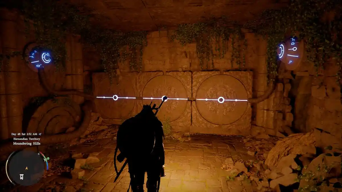 Crimson Desert не только проверяет реакцию в жестоких боях, но и заставляет регулярно тренировать логику. Огромный континент буквально усеян загадками древних цивилизаций: от необязательных секретов до сюжетных преград. Разработчики принципиально отказались от системы подсказок, предоставляя игрокам полную свободу действий. Для многих такая бескомпромиссность становится настоящим испытанием на прочность, особенно на ранних этапах игры. Одной из первых подобных проверок на сообразительность станет посещение Древних Руин в регионе Эрнанд. Чтобы разгадать их тайны и открыть точку быстрого перемещения, придется разобраться с хитрым механизмом. Принцип головоломки Оказавшись внутри Древних Руин, необходимо внимательно осмотреть стену. В нее вмонтированы три круглых каменных колеса (диска). Одно из них всегда выступает вперед, явно намекая на возможность взаимодействия. Главная цель испытания — задвинуть все три диска так, чтобы они оказались вровень со стеной (заподлицо). Инструмент для реш