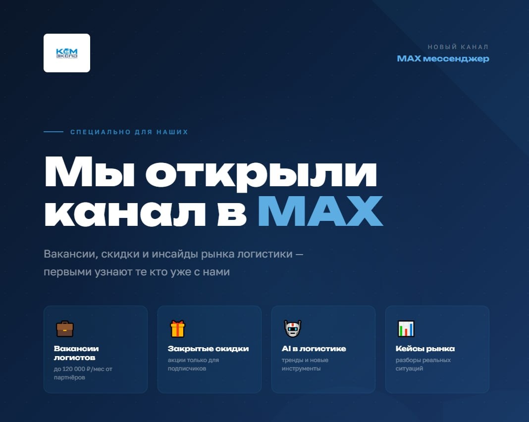! Специально для наших клиентов — всё что поможет расти в логистике: 💼 Вакансии от партнёров-работодателей 🤖 AI в логистике — тренды и новые инструменты 📊 Кейсы и разборы реального рынка 👉 https://max.ru/id9715449320_biz