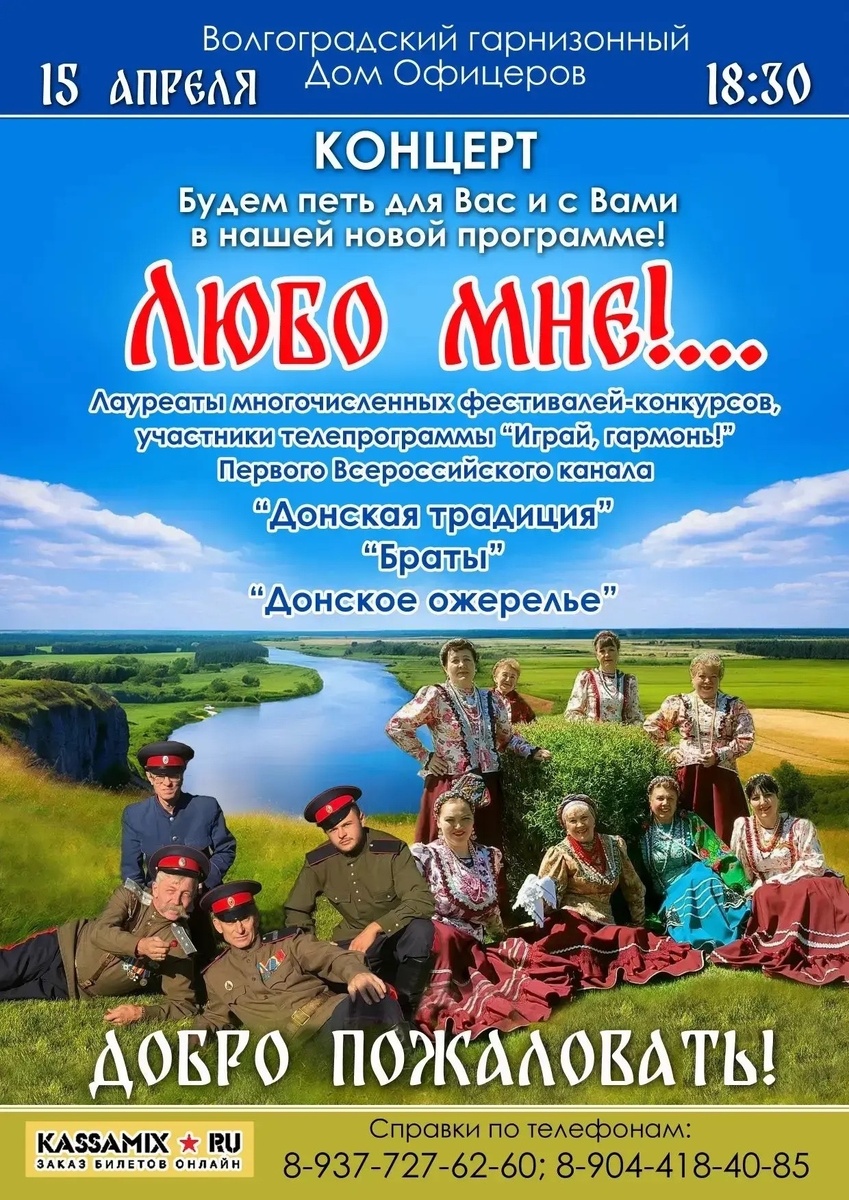 Друзья! Приглашаем Вас 15.04 в 18.30 в Дом офицеров на нашу весеннюю программу, подготовленную для Вас, наши дорогие, любимые зрители Лауреатами многочисленных фестивалей-конкурсов, участниками программы "Играй, гармонь!" Первого Всероссийского канала, ансамблями Волгоградского гарнизонного Дома офицеров: "Донское ожерелье", "БраТы", "Донская традиция".