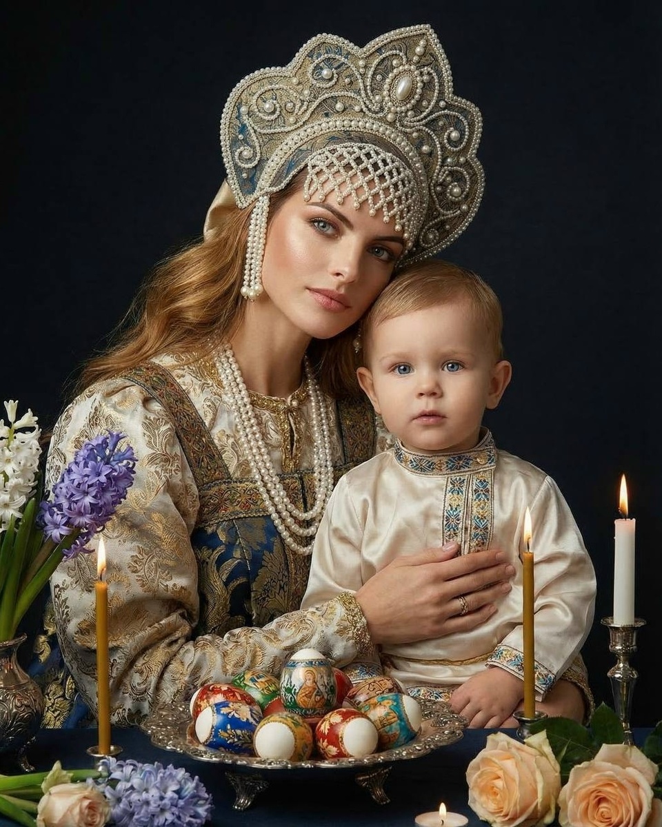 1) Заходим в БОТ ВК или БОТ ТГ 2) Жмем Выбор модели => Nano Banana PRO/Nano Banana 2 3) Добавляем свой фото (важно фото БЕЗ ретуши и любой обработки и фильтров), вставляем этот ПРОМТ: Изысканный студийный портрет в стиле «русский ренессанс». Девушка в кокошнике, расшитом жемчугом, и парчовом платье нежно обнимает сидящего рядом 2-летнего мальчика в нарядной шелковой рубахе. На переднем плане — роскошная пасхальная композиция: крашенки в серебряном блюде, свечи и живые цветы. Фон нейтральный, глубокий. Профессиональное художественное освещение, подчеркивающее блеск жемчуга и нежную кожу ребенка. Высочайшая детализация, насыщенная палитра (золото, глубокий синий, белый). —ar 3:4. Не меняй черты лица и цвет волос !! Еще больше промтов в группе ВК и в канале MAX !! Подписывайся, чтобы не потерять!! Делитесь результатами в комментариях:)