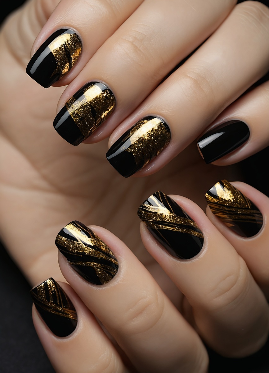 Золотые мазки можно эффективно сочетать с различными текстурами и элементами дизайна, создавая гармоничные и выразительные образы. Например, комбинация с фольгированием или стразами добавляет блеска и объемности. При использовании золотой краски в сочетании с пастельными оттенками получается нежный и элегантный маникюр, который подойдет для любого повода. Также можно экспериментировать с геометрическими формами, добавляя золотые акценты к строгим линиям.