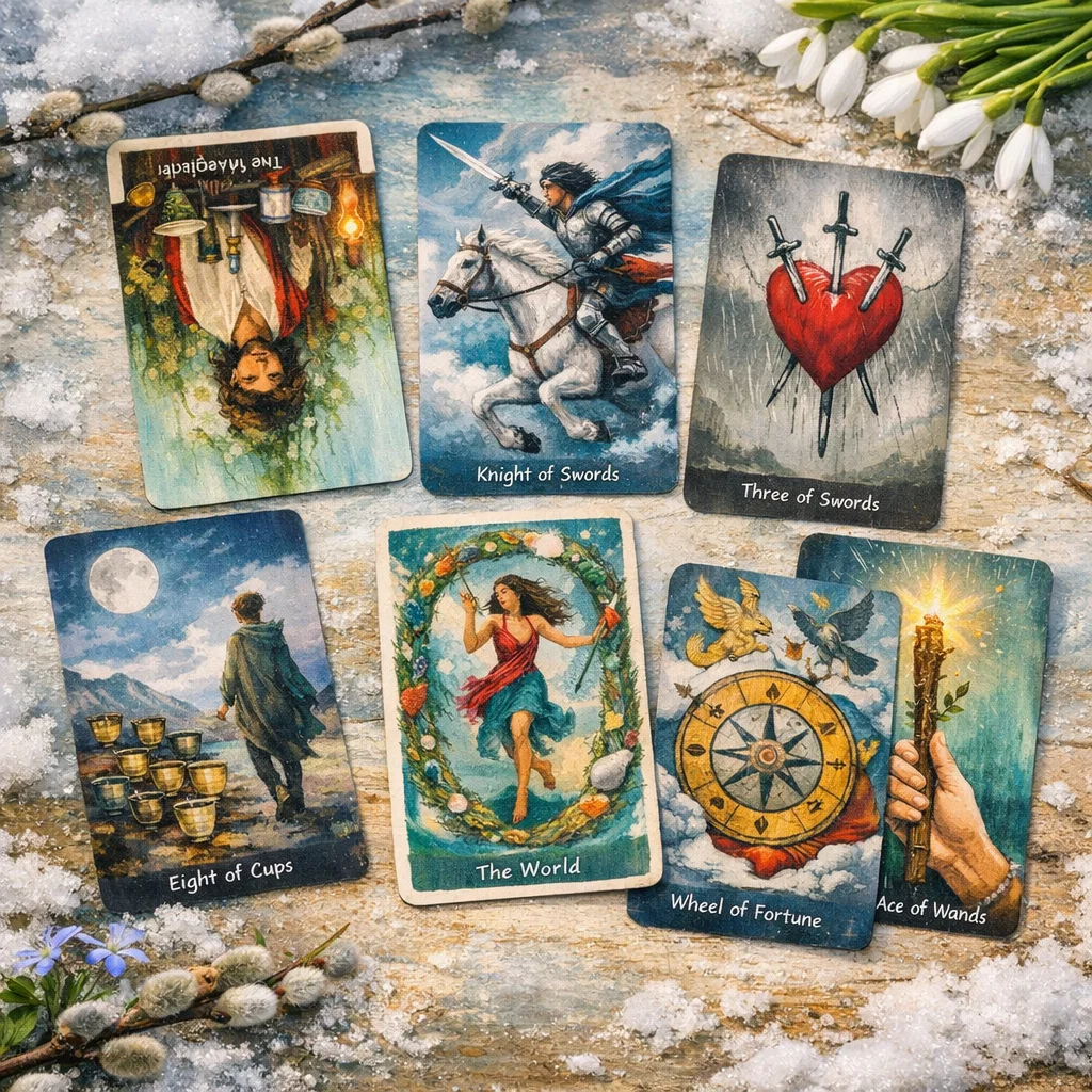 Карты расклада: Маг перевёрнутый, Рыцарь Мечей, Тройка Мечей, Восьмёрка Кубков, Мир, Колесо Фортуны, Туз Жезлов.