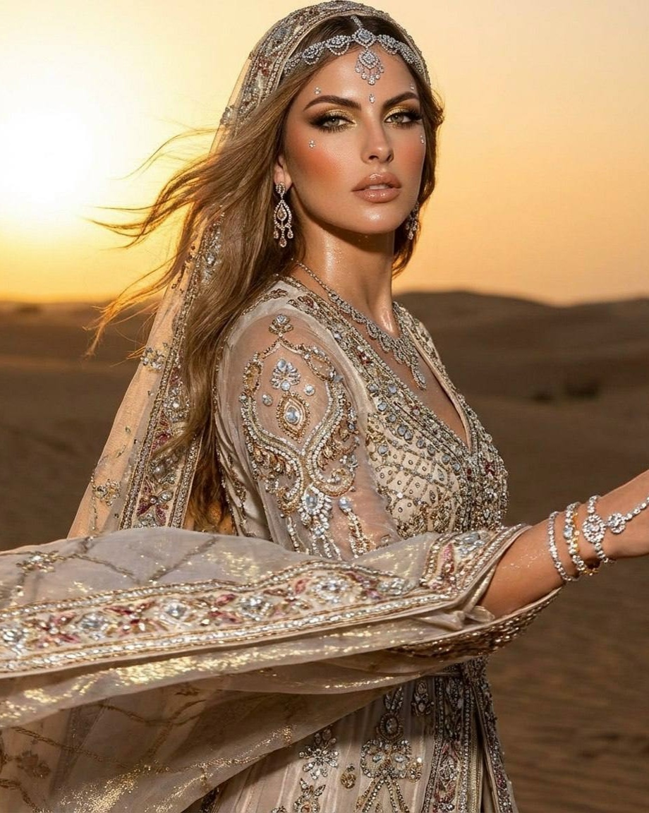 1) Заходим в БОТ ВК или БОТ ТГ 2) Жмем Выбор модели => Nano Banana PRO/Nano Banana 2 3) Добавляем свой фото (важно фото БЕЗ ретуши и любой обработки и фильтров), вставляем этот ПРОМТ: Создай не меняя черты лица и цвет волос на фоне пустынного пейзажа на закате в "золотой час". На ней изысканный, струящийся наряд в восточном стиле, выполненный из бриллиантов, драгоценных камней и роскошных тканей, которые переливаются в теплом золотистом свете. Ее голову украшает невероятно красивая восточная вуаль, замысловато украшенная и элегантная. Ее волосы развеваются на ветру, создавая неземную атмосферу. Ее лицо украшено изящными бриллиантовыми вставками, которые слегка поблескивают, дополняя роскошный макияж: мерцающие золотые тени для век (макияж глаз смоки айз)с замысловатой подводкой, длинные пышные трепещущие ресницы, идеально очерченные брови, теплые персиковые румяна и блестящие губы телесного цвета. Ее кожа блестит Она носит роскошные украшения, в том числе украшенный бриллиантами головн