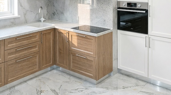 Цоколь с качественным покрытием эффективно защищает мебель от влаги и легко чистится, что упрощает уход за кухней.