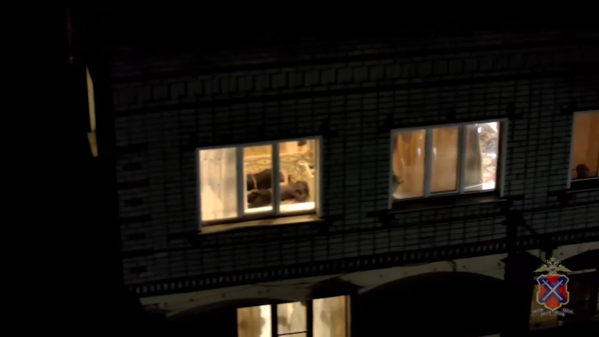 Дроны отчетливо видят всю картинку с высоты и даже то, что происходит в чьих-то окнах. Так, лицом в пол уже в какой-то момент лежат задержанные. В конце всех задержанных выстроили в ряд вдоль гаражей.