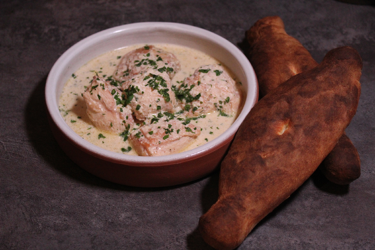 📋 Курица - 1 шт. Чеснок - 7-8 зубчиков Сливки нежирные(можно заменить молоком) - 400 мл Уцхо-сунели - 1,5 ч.л. Соль - 1 ч.л. Молотый черный перец - 1ч. л. Разделываем курицу Режем на куски Добавляем соль, молотый перец небольшое количество растительного масла, перемешиваем и даём промариноваться минут 30. Пока курица маринуется, мелко рубим чеснок и зелень. На сильном огне обжариваем курицу с двух сторон до золотистой корочки. На сковороде , где жарилась курица, обжариваем чеснок 1,5 минуты. Затем добавляем сливки, уцхо-сунели и перемешав, на медленном огне довести до слабого кипения. Возвращаем обратно курицу и томим под крышкой 10 минут, периодически поливая соусом. Затем добавляем зелень, перемешиваем и подаём к столу. Приятного аппетита!