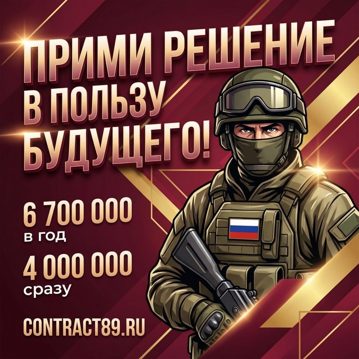 Контракт с ВС РФ от Ямала - это возможность обеспечить себя и близких: ✔️ 6 700 000 ₽ в год ✔️ 4 000 000 ₽ единовременно ✔️ от 225 000 ₽ ежемесячно в зоне СВО Подробнее: contract89.ru