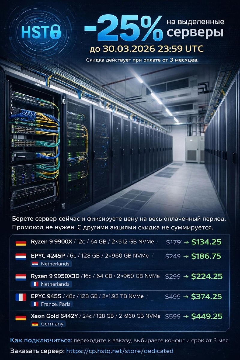 Скидка действует при оплате от 3 месяцев. Берете сервер сейчас и фиксируете цену на весь оплаченный период. Промокод не нужен. С другими акциями скидка не суммируется. Конфигурации: Ryzen 9 9900X / 12c / 64 GB / 2×512 GB NVMe / 1 Gbps Unmetered / Germany / $179 → $134.25 EPYC 4245P / 6c / 128 GB / 2×960 GB NVMe / 3 Gbps Unmetered / Netherlands / $249 → $186.75 Ryzen 9 9950X3D / 16c / 64 GB / 2×960 GB NVMe / 1 Gbps Unmetered / Netherlands / $299 → $224.25 EPYC 9455 / 48c / 128 GB / 2×1.92 TB NVMe / 1 Gbps Unmetered / France, Paris / $499 → $374.25 Xeon Gold 6442Y / 24c / 128 GB / 2×960 GB NVMe / 5 Gbps Unmetered / Germany / $599 → $449.25 Как подключиться: переходите к заказу, выбираете конфиг и срок от 3 месяцев. Если нужен сервер под storage, high-load, proxy или streaming задачи, соберем конфиг под запрос и дадим ответ по варианту в течение 30 минут. Бесплатное администрирование доступно для всех тарифов: базовая первичная настройка сервера, установка ОС, помощь с дисками и сеть