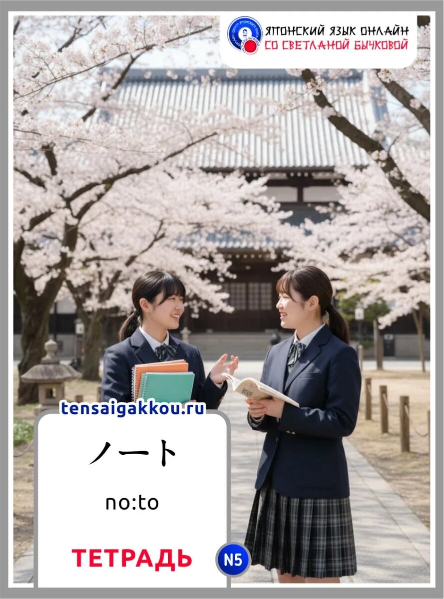 👋☺️Сегодня запоминаем слово ノート / no:to / тетрадь; блокнот. ✳️ Объяснение значения слова на японском языке (продвинутый уровень): 「ノート」は英語の「notebook」をカタカナにした外来語で、主に「文字や図を書き留めるための冊子」を指します。 Примеры предложений: ノート no:to тетрадь; блокнот 1. 新しいノートを買いました。 Atarashii no:to o kaimashita. Я купил (-а) новую тетрадь. 2. このノートはだれのですか。 Kono no:to wa dare no desu ka? Чья это тетрадь? 3. ノートに名前を書いてください。 No:to ni namae o kaite kudasai. Напишите, пожалуйста, имя в тетради. 4. 大事なことをノートに書きます。 Daijina koto o no:to ni kakimasu. Важные вещи я записываю в блокнот. 🎧 Слушайте эти предложения на японском языке на нашем канале в MAX 👈 Для практики составляйте свои примеры предложений на японском языке и пишите их в комментариях для проверки 👌 🔴🔗 Бесплатно записаться на онлайн-курс по запоминанию японских иероглифов