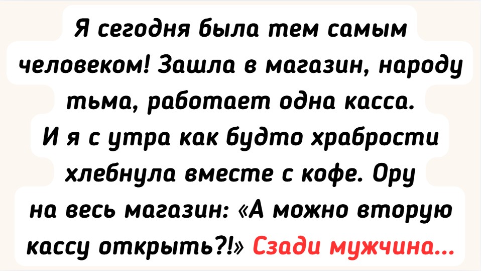 - Я сегодня была тем самым человеком! Зашла в магазин, народу тьма, работает одна касса. И я с утра как будто храбрости хлебнула вместе с кофе. Ору на весь магазин: «А можно вторую кассу открыть?!» Сзади мужчина такой: «Наконец-то это кто-то сказал». В общем хихикнули всей очередью, а я на ватных ногах от пережитого пошла к кассе, которую все-таки открыли. @ ekaterinakuznetsovay